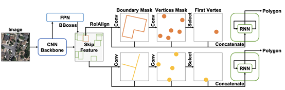 PolyMapper基于MaskRCNN架构识别建筑物与道路的边界掩膜。通过该掩膜识别出关键顶点,并确定起始点位置后运用递归神经网络对所有顶点进行自回归迭代处理以生成闭合多边形。
