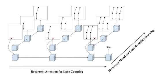基于稀疏点云扫描数据进行接收并生成具有车道边界实例的道路网络层次化表示的方法中包含两个递归神经网络组件分别负责确定各条车道线起始位置以及依次沿着各车道线连接后续顶点这样的过程两个递归神经网络采用层级架构组织从而实现了对道路网路细节特征的有效捕捉与建模