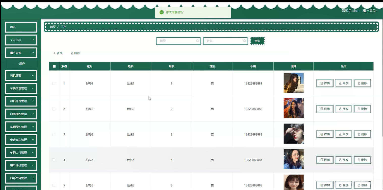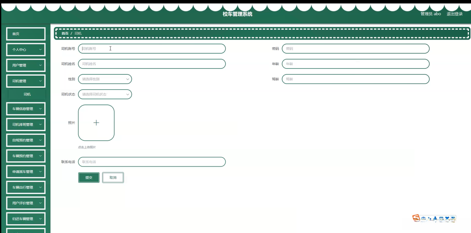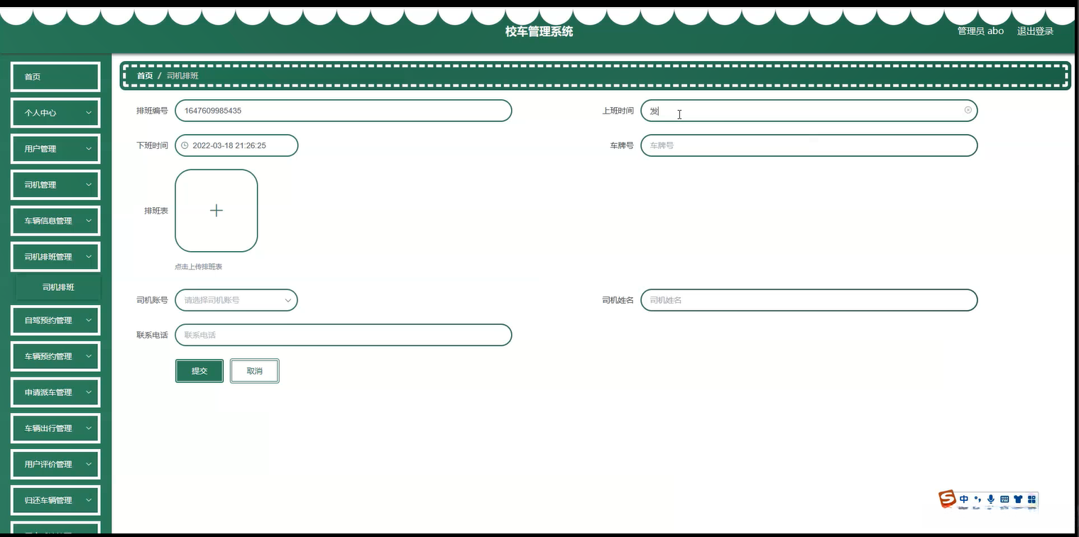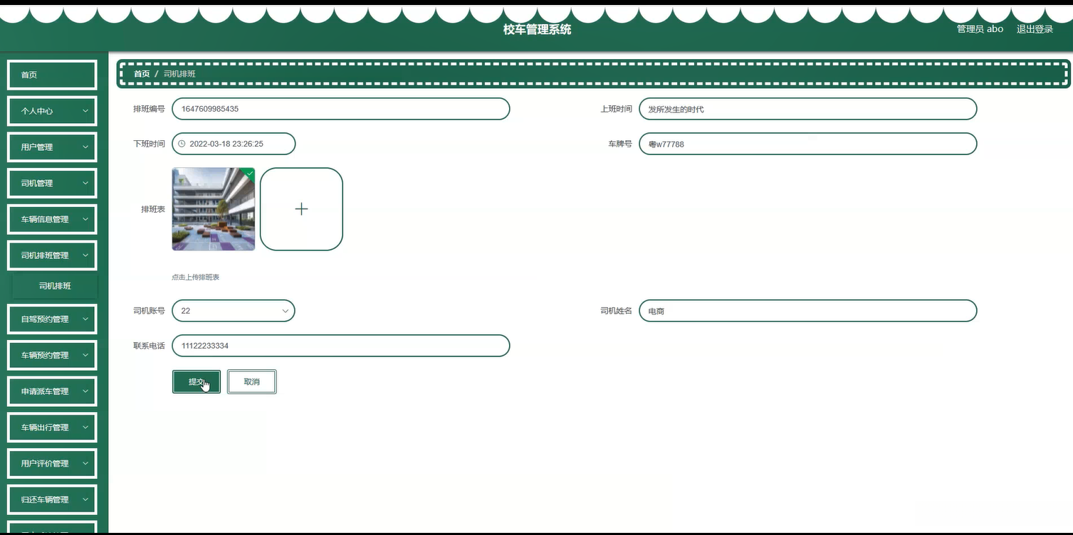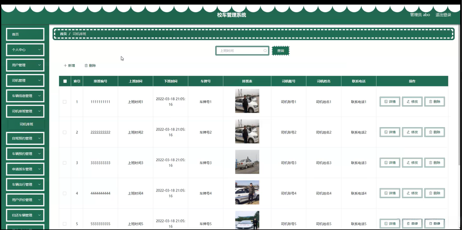 系统内容:个人用户、车况信息、司机、车辆安排、排班调度、派车订单提交、行程安排、客户反馈(用户反馈)记录管理模块