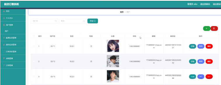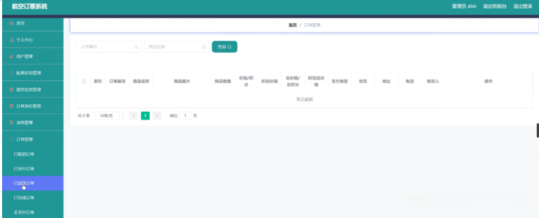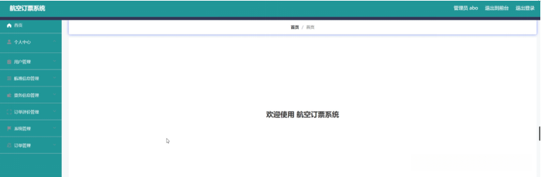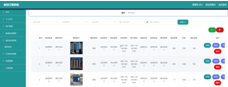 管理员登录进入系统之后,就可以对所有的信息进行查看,可以查看到首页、个人中心、用户管理、航班信息管理、票务信息管理、订单评价管理、系统管理、订单管理等,并且还可以对其进行相应的操作管理,如图5-7所示。