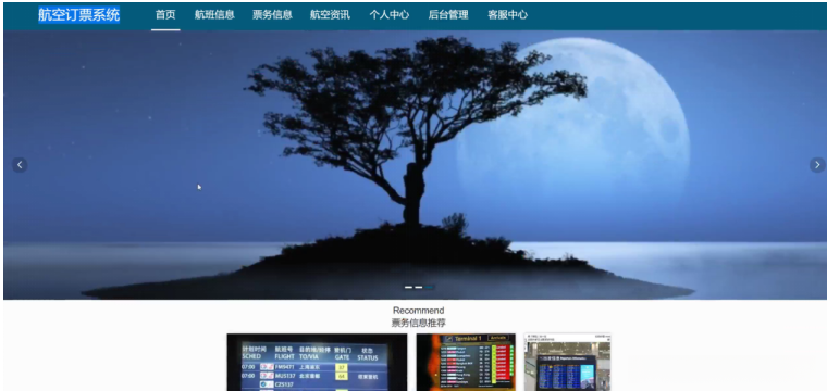 航空订票系统,在系统的首页可以查看首页、航班信息、票务信息、航空资讯、个人中心、后台管理、客服中心等信息进行详细操作,如图5-1所示。