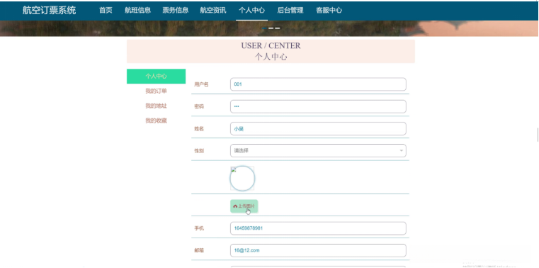 用户注册,在用户注册页面通过填写用户名、密码、姓名、手机、邮箱、身份证等信息完成用户注册,如图5-4所示。在个人中心页面通过填写用户名、密码、姓名、性别、图片、手机、邮箱等信息进行个人信息更新操作,还可以根据需要对我的订单、我的地址、我的收藏进行相应操作;如图5-5所示。