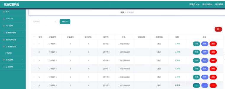 订单评价管理,在订单评价管理页面中可以对索引、订单编号、订单评分、服务评分、用户名、手机、审核回复、审核状态、审核等信息进行详情,修改或删除等操作,如图5-11所示。