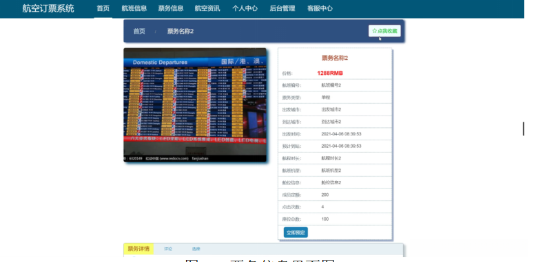 票务信息,在票务信息页面中可以查看票务名称、价格、图片、航班编号、票务类型、出发城市、到达城市、出发时间、预计到站、航程时长、航班机型、舱位信息、成员定额、点击次数、座位总数、票务详情等信息,并进行立即预定、评论、选座或收藏;如图5-3所示。