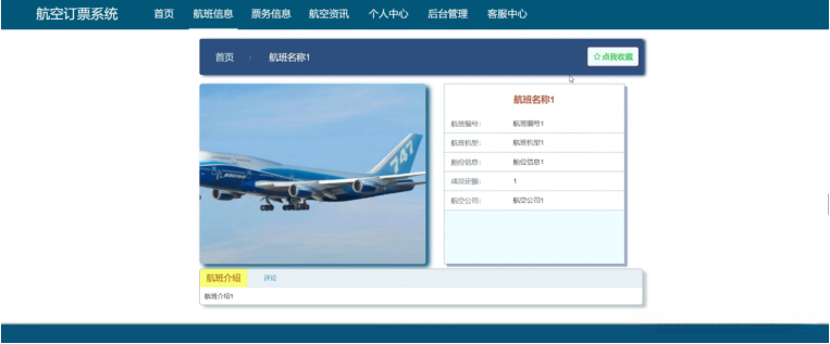 航班信息,在航班信息页面中可以查看航班名称、航班编号、航班机型、图片、舱位信息、成员定额、航空公司、航班介绍等信息,并进行评论或收藏;如图5-2所示。