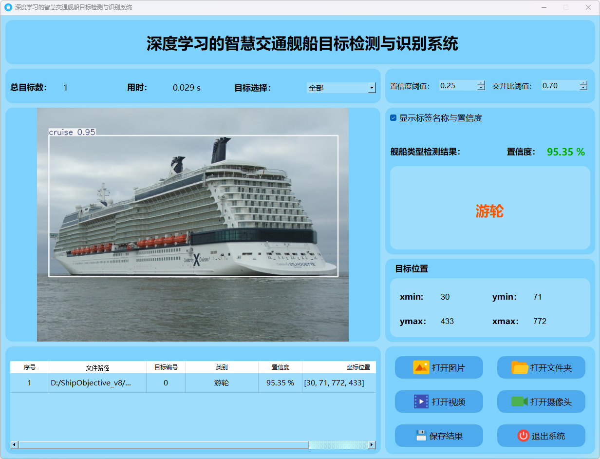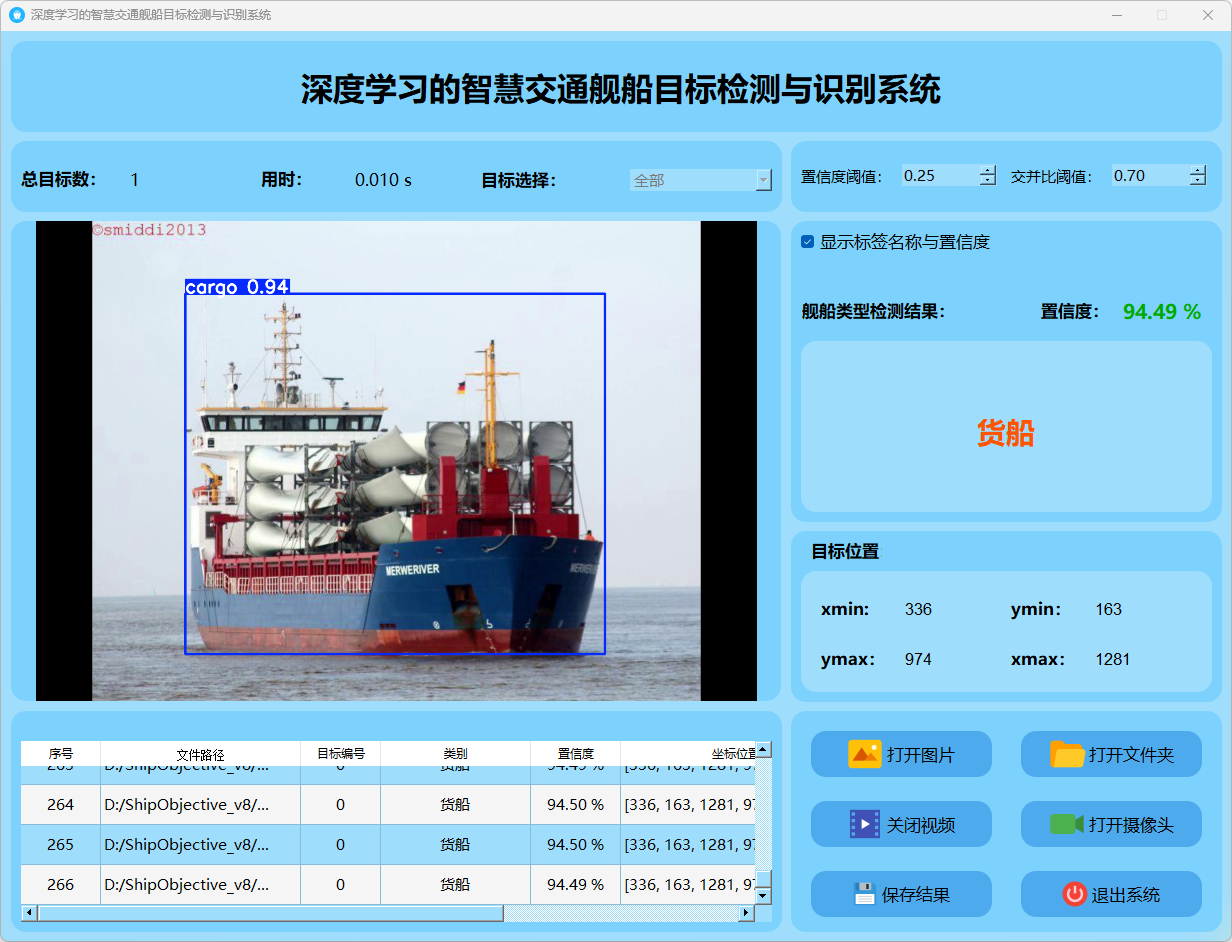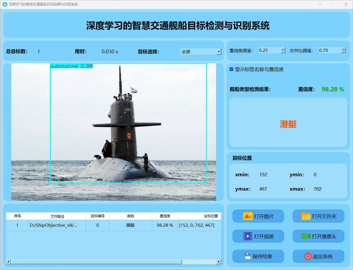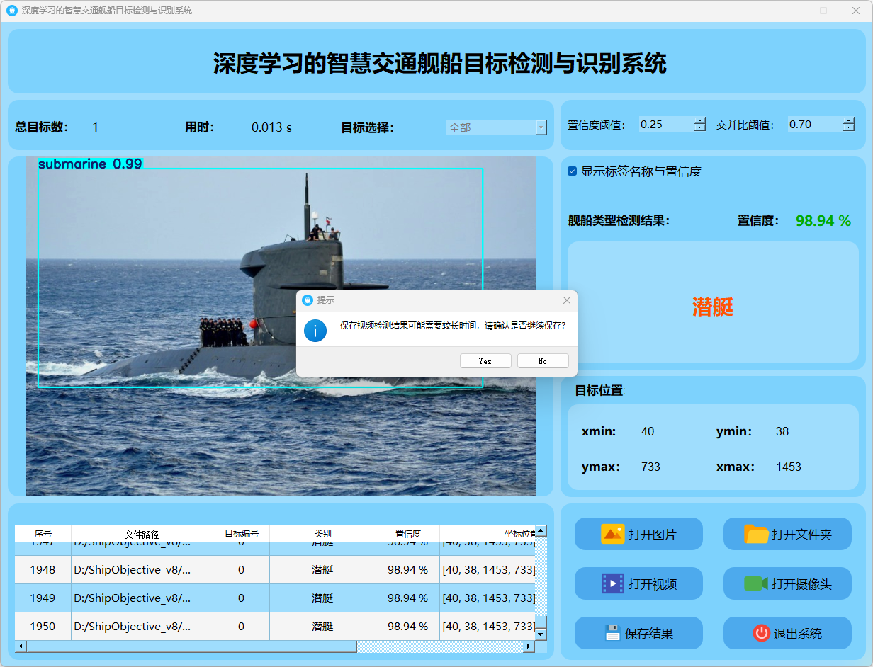 检测结果:该系统对视频进行实时分析运行处理,并识别出舰船目标后记录其位置信息。表格记录了视频中多个检测结果的相关置信度和位置数据。
