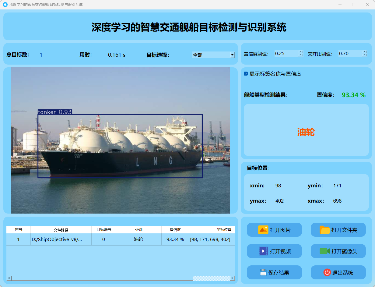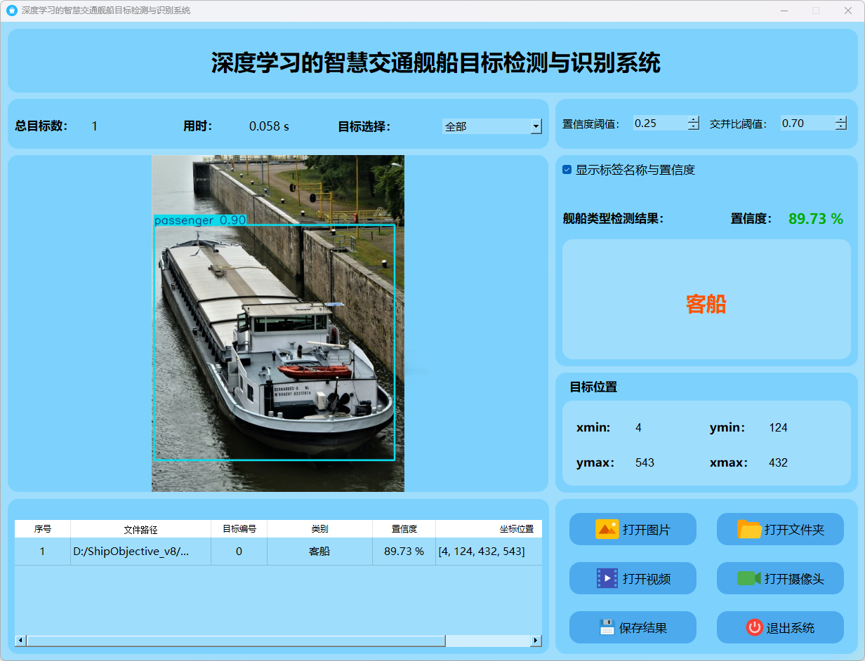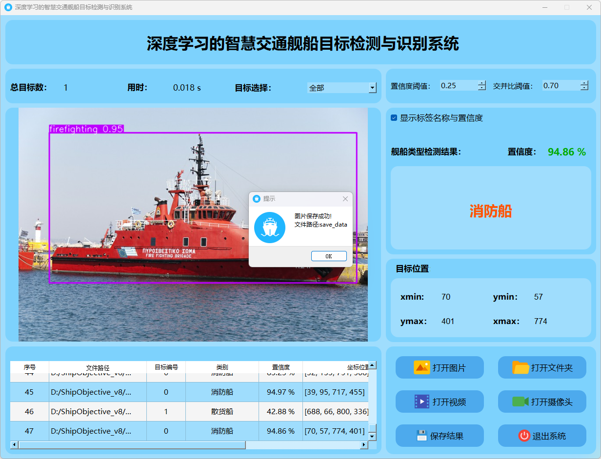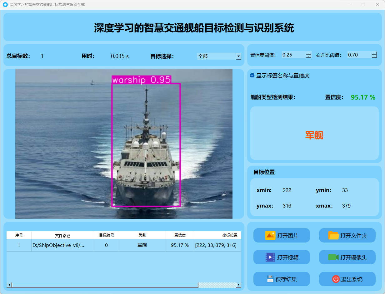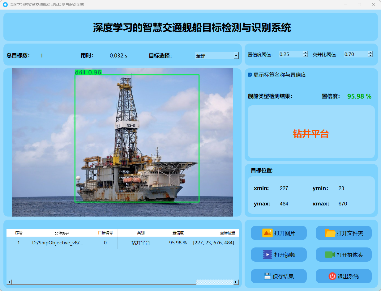 检测结果:该系统对视频进行实时分析运行处理,并识别出舰船目标后记录其位置信息。表格记录了视频中多个检测结果的相关置信度和位置数据。