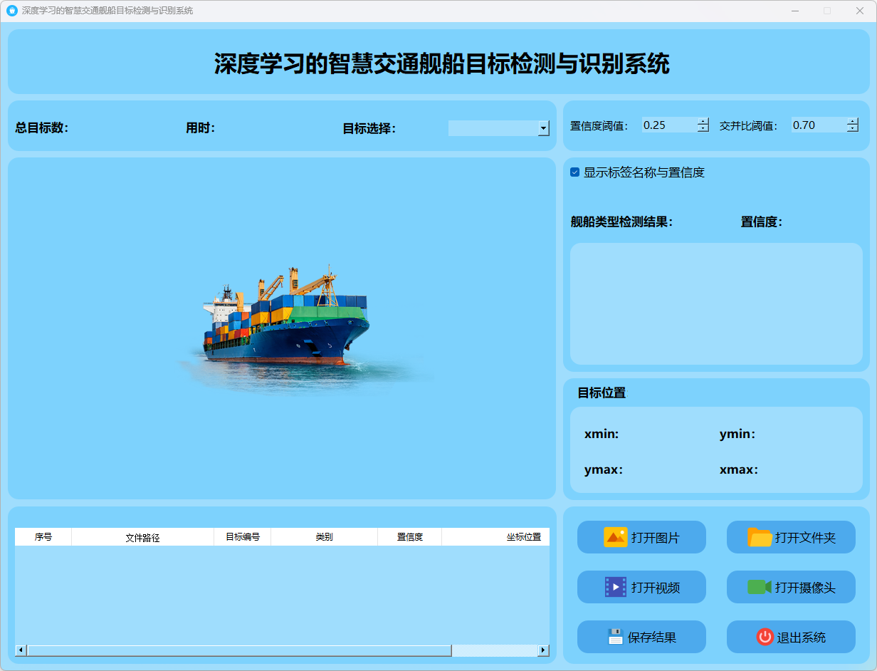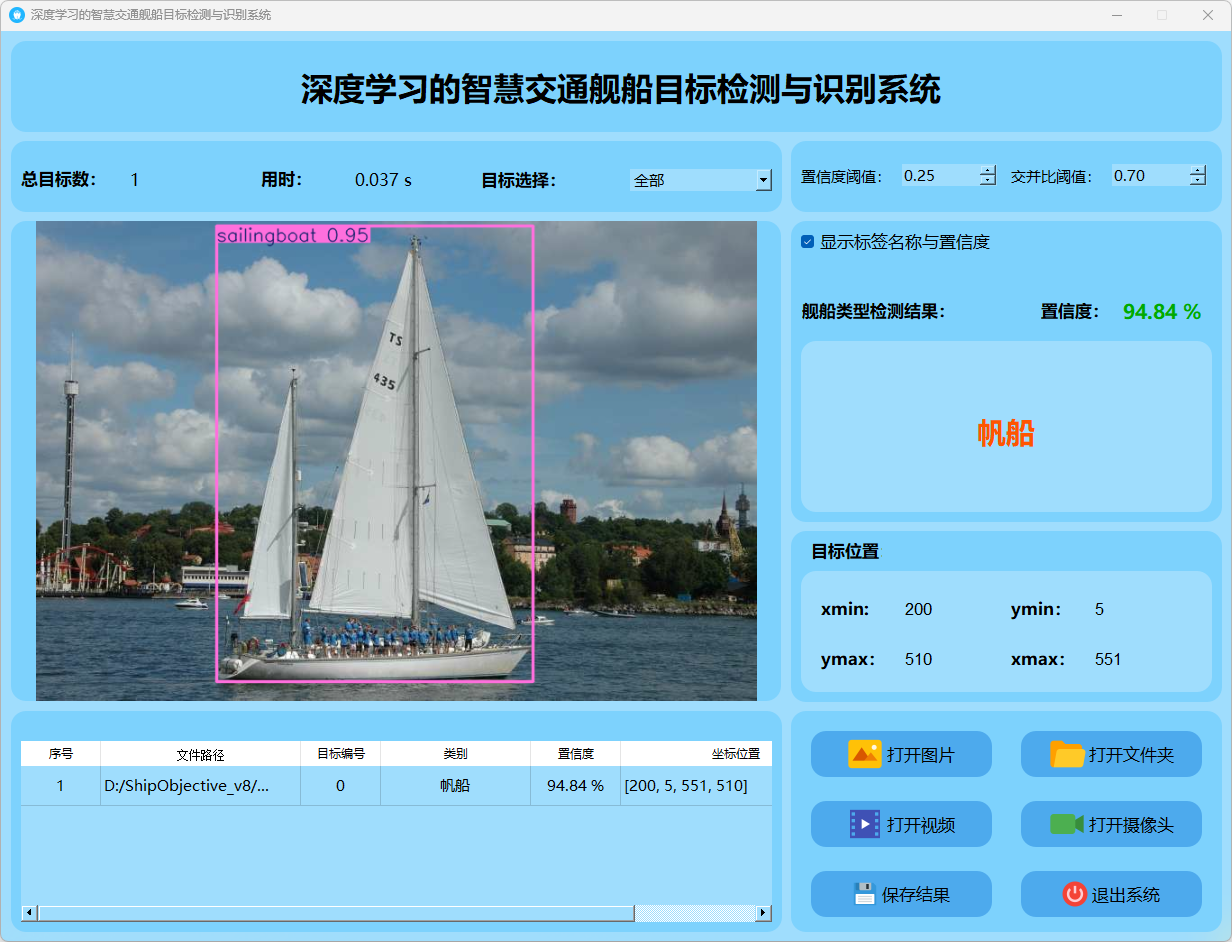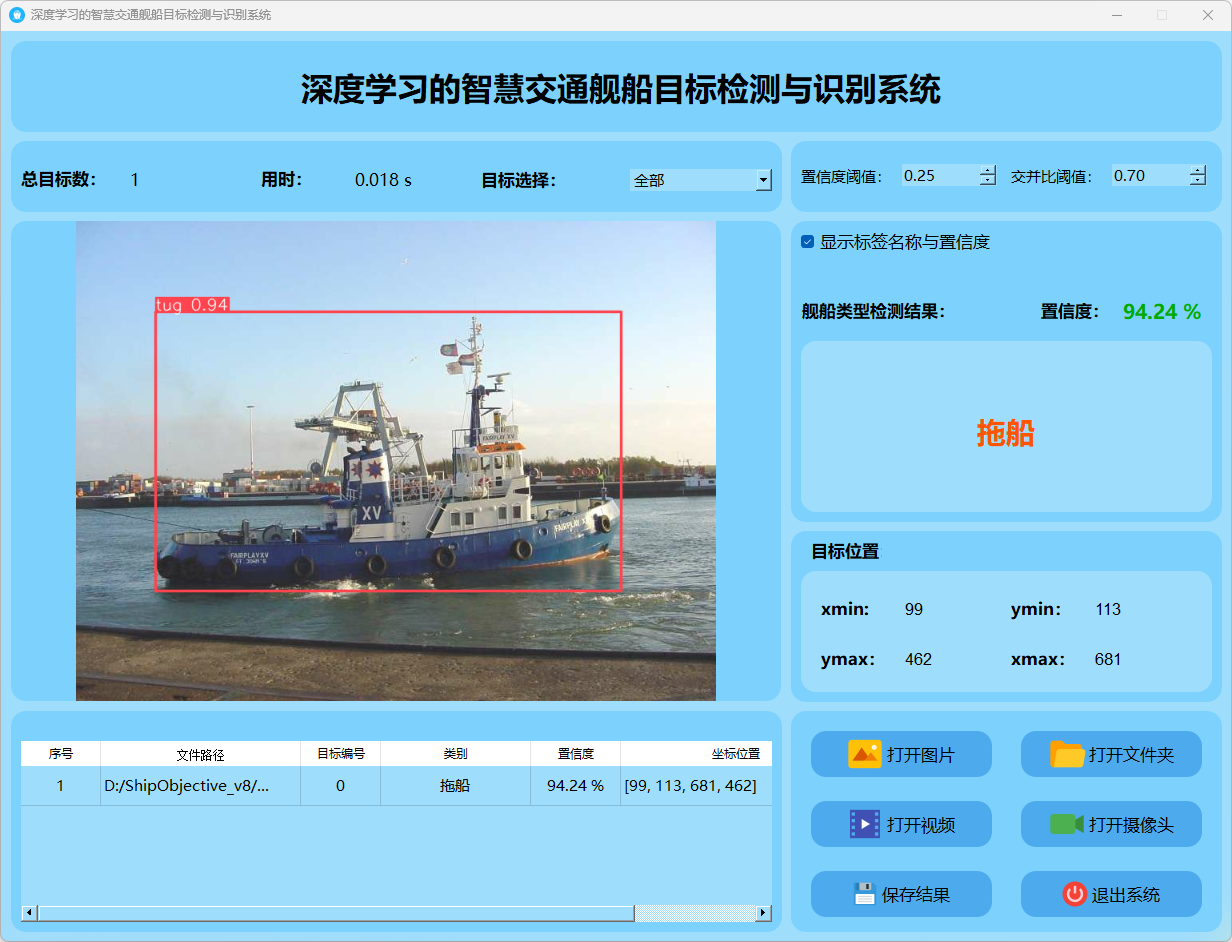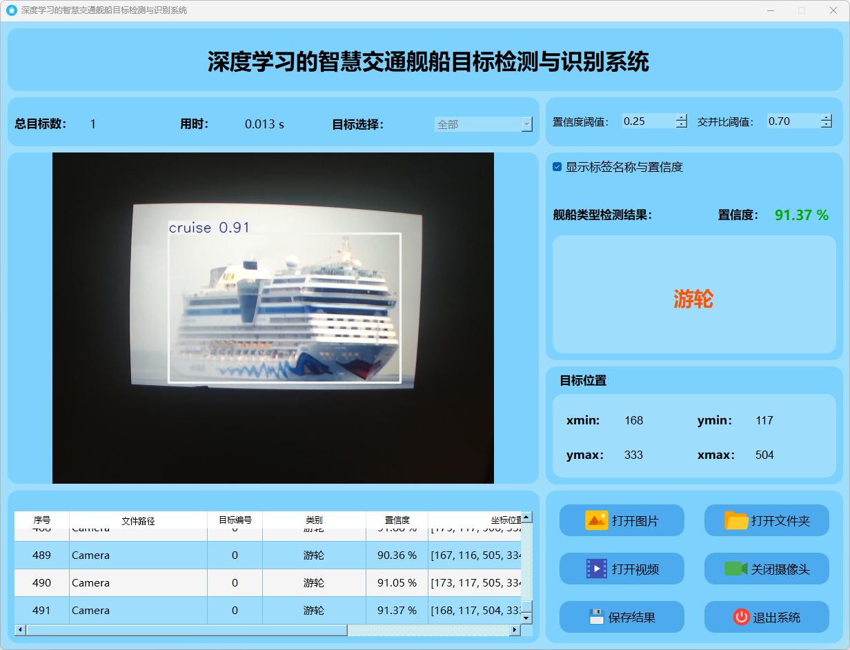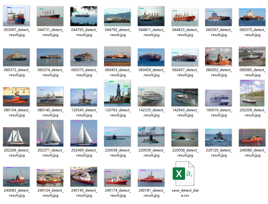 检测结果:通过摄像头实现了实时数据采集。识别出目标船只,并将分析结果予以呈现。持续监控摄像头的画面内容,并对识别出的行为位置进行了标记。数据记录表中列示了每帧图像中的详细分析数据。