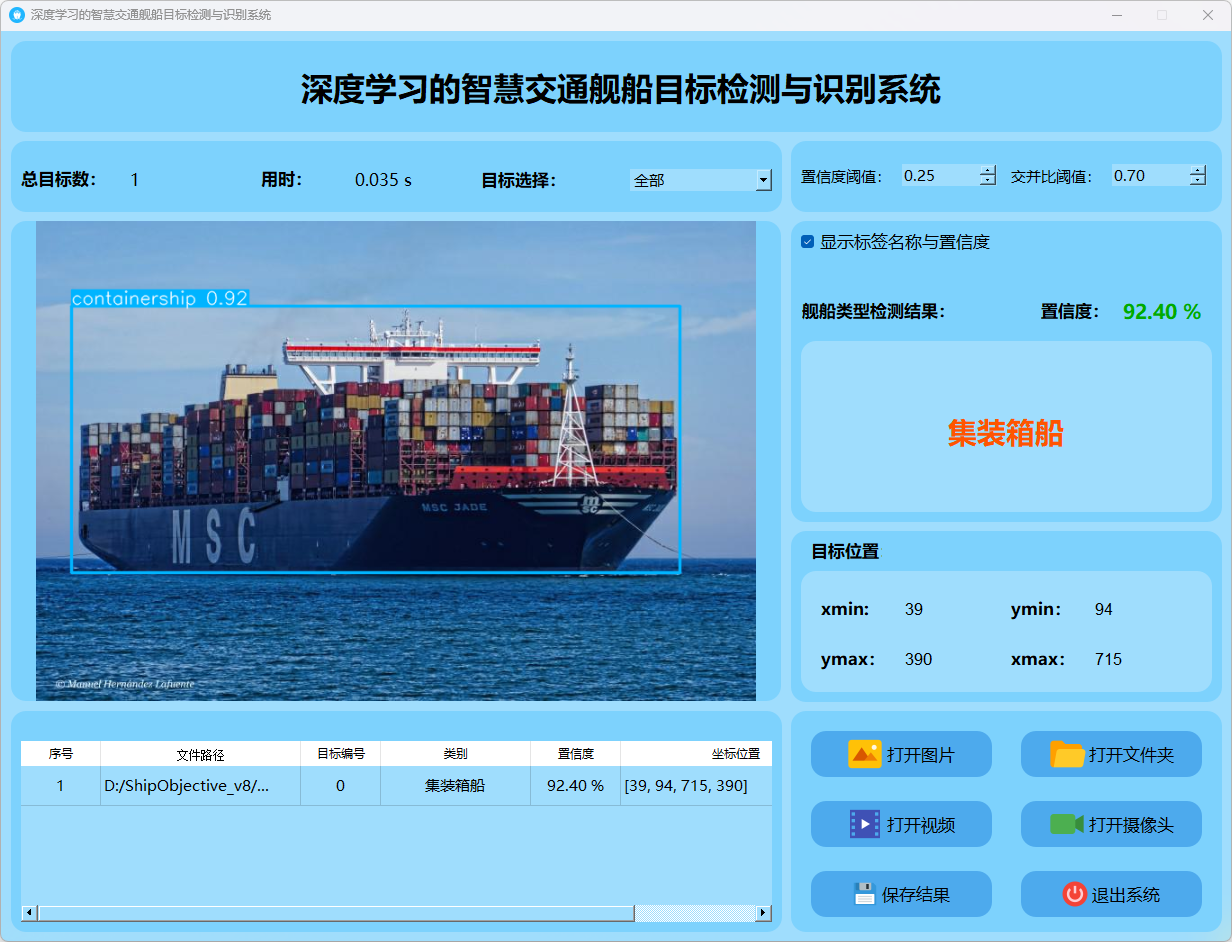 该界面呈现了系统在视频帧中的多目标检测能力。系统能够通过精确识别舰船目标实现智能化分析功能,并能输出详细的数据结果以及相应的置信度评估。