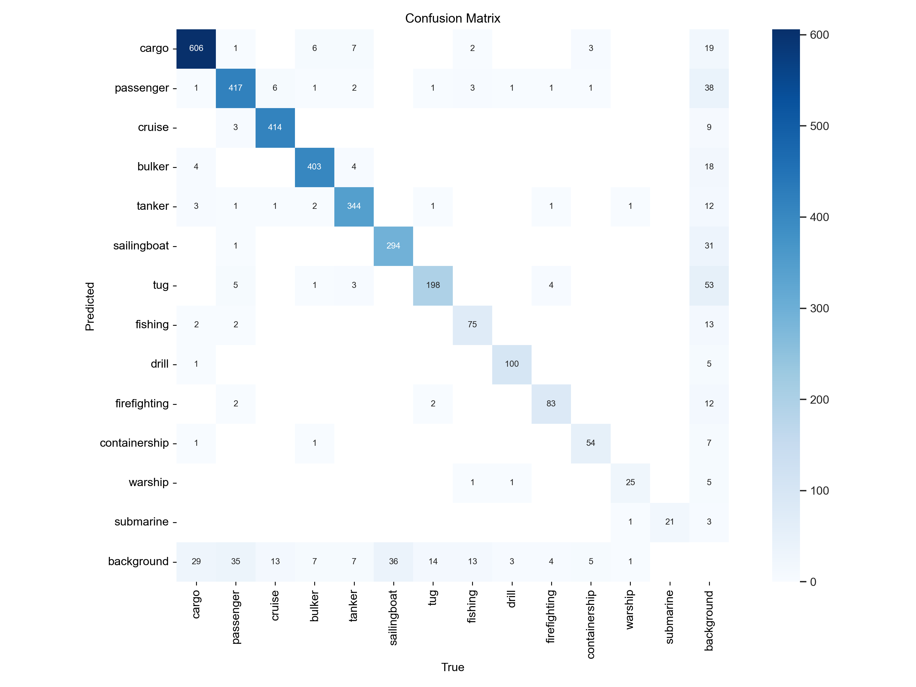 (2)在少数小样本类别中(包括渔船与潜艇这类),该算法目前的表现仍需进一步优化。