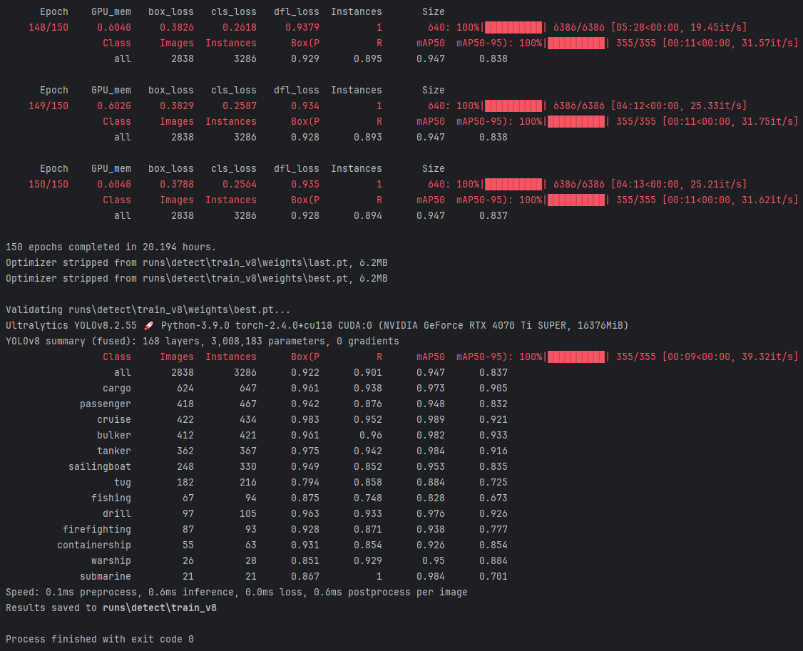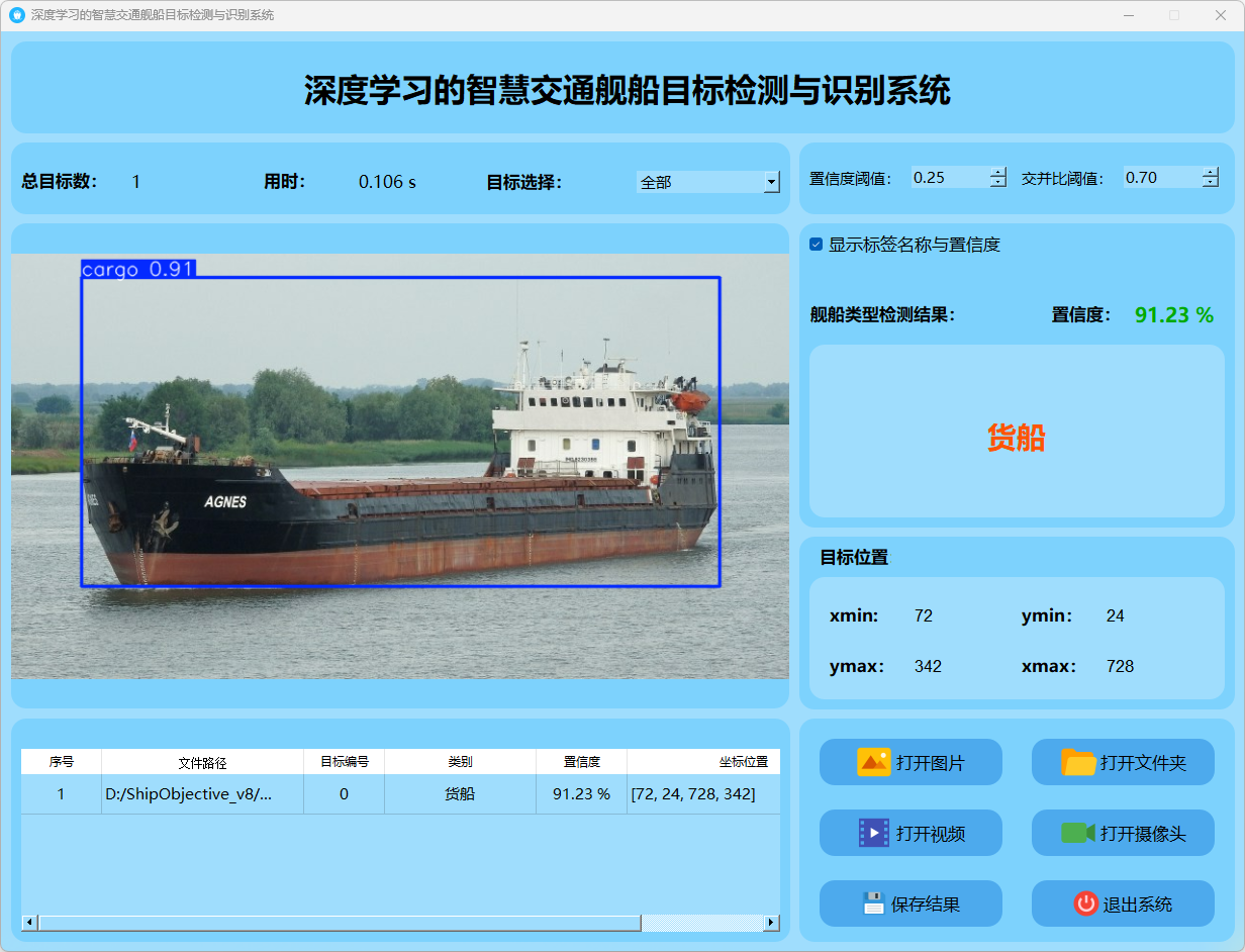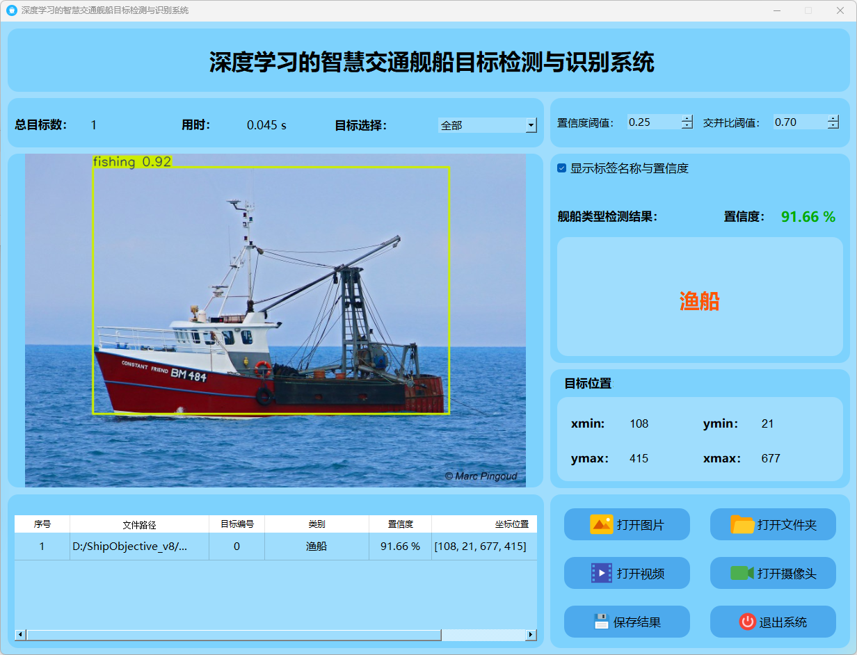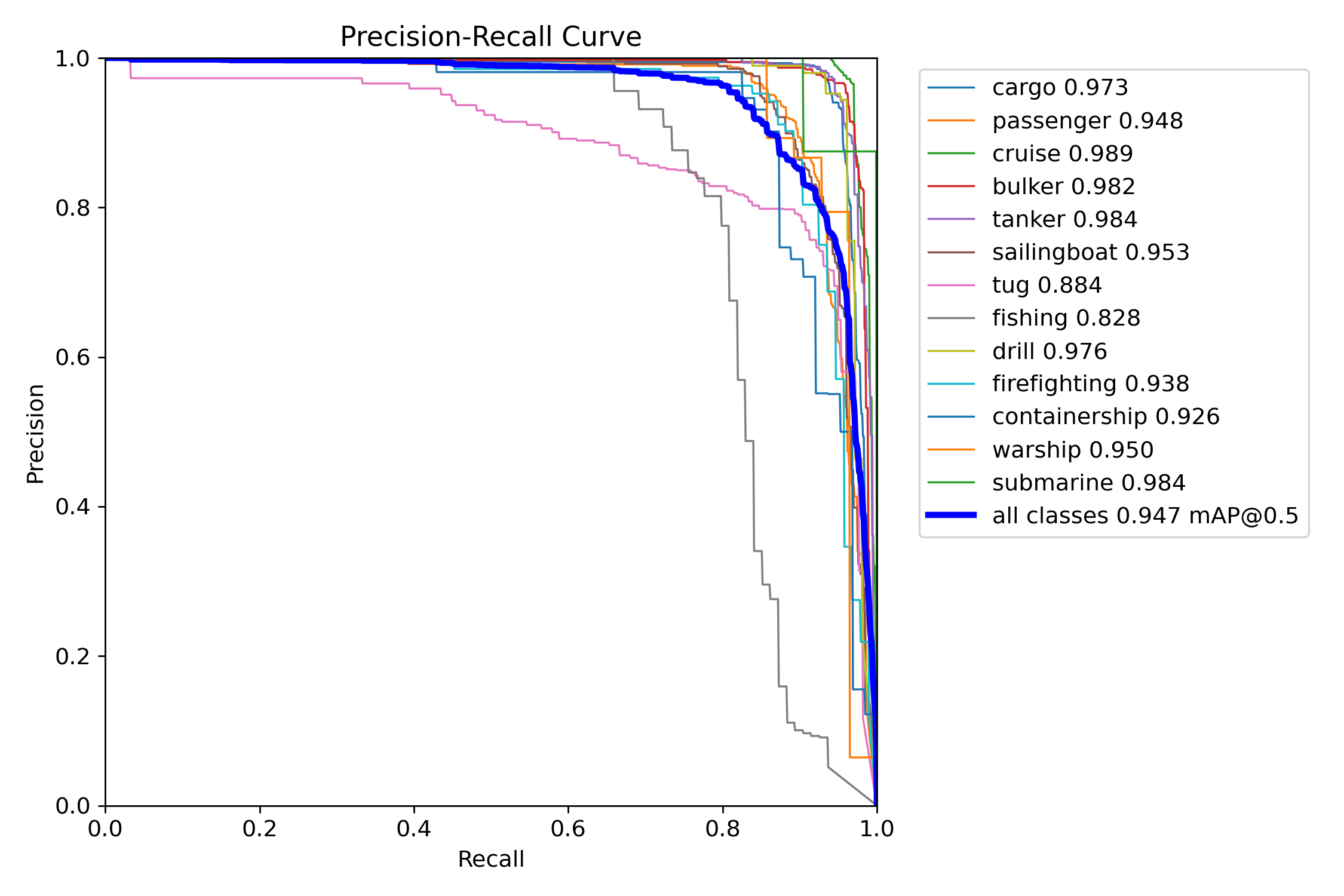 通过系统性的训练和验证,在各类舰船检测精度与召回率指标方面均实现了明显的性能进步。特别是在应对多变的天气状况、不同的光照环境以及复杂的背景设置时,YOLOv8模型展现了卓越的适应能力。该系统不仅具备处理海量数据的能力,并且能够即时生成精确的检测报告,在海洋交通管理与安全监控的实际需求中表现尤为突出