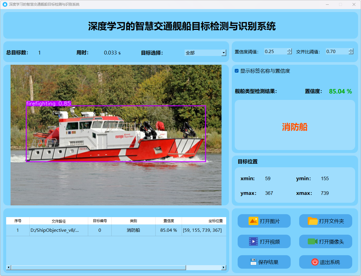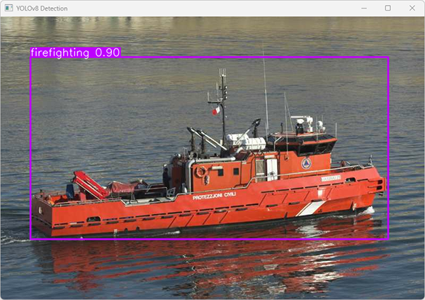 (1)模型在图片中检测到 1 个消防船(firefighting)。