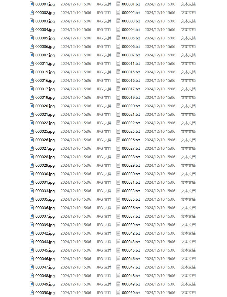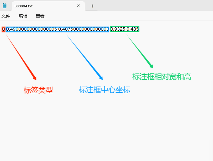 存储标签数据的文件名应与图片名称一致,并包含N行5列的数据。每一条记录代表一个标注的目标。通常情况下包含五个参数:第一个参数为类别ID;第二个和第三个参数分别为标注框中心坐标的X轴和Y轴值;最后两个参数分别表示标注框在X轴方向上的宽度与Y轴方向上的高度。