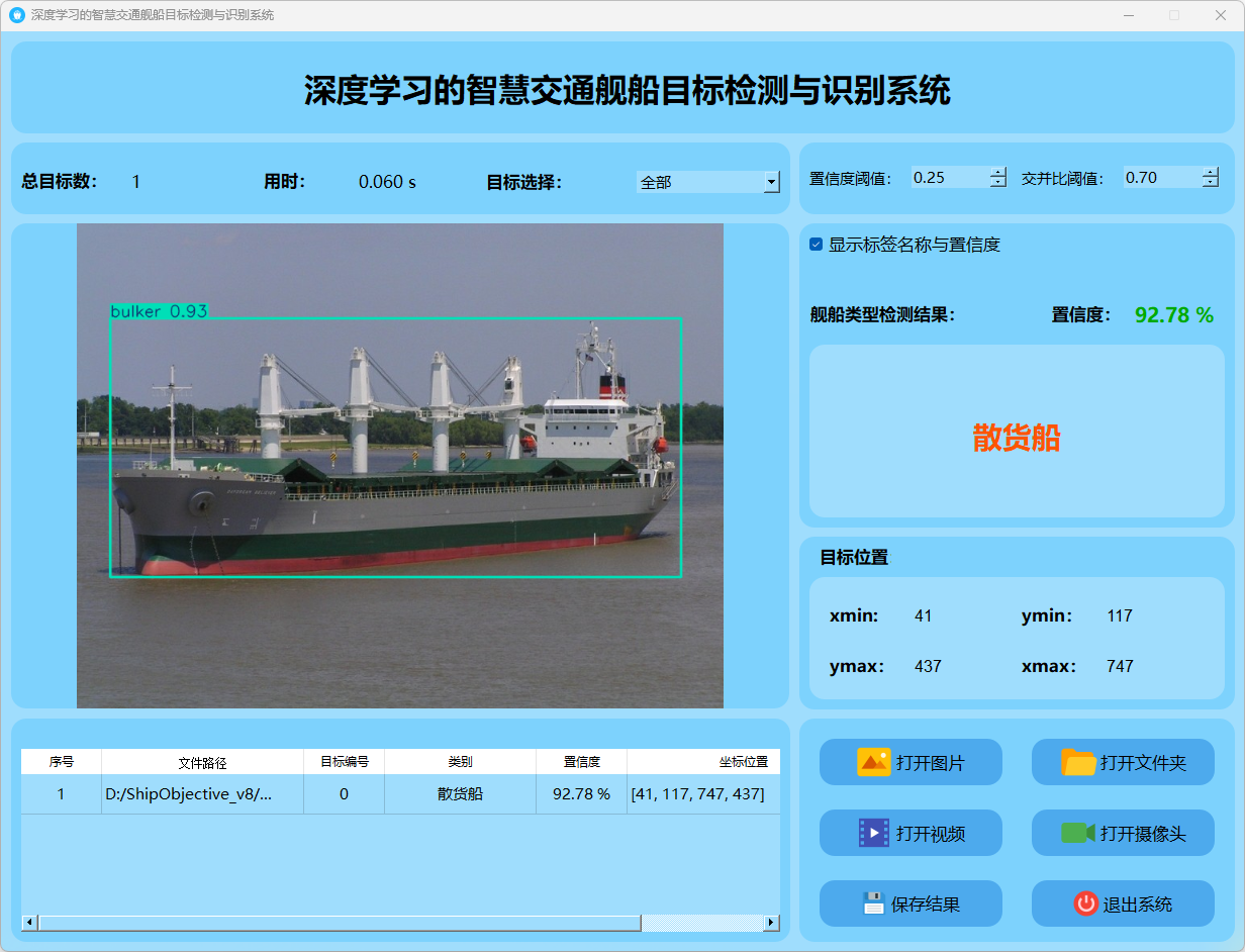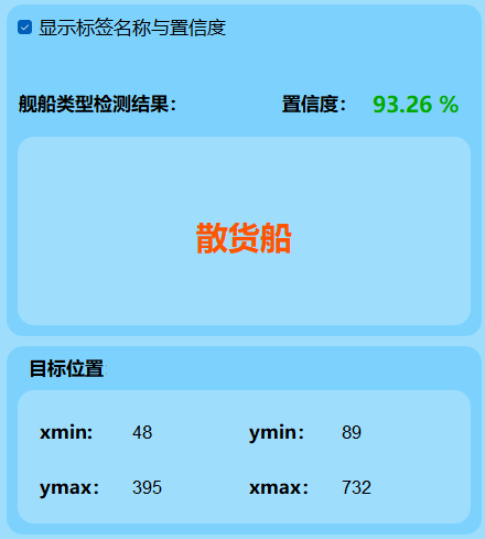 (1)这表明模型对于检测到的目标属于"散货船"类别拥有93.26%的置信度。