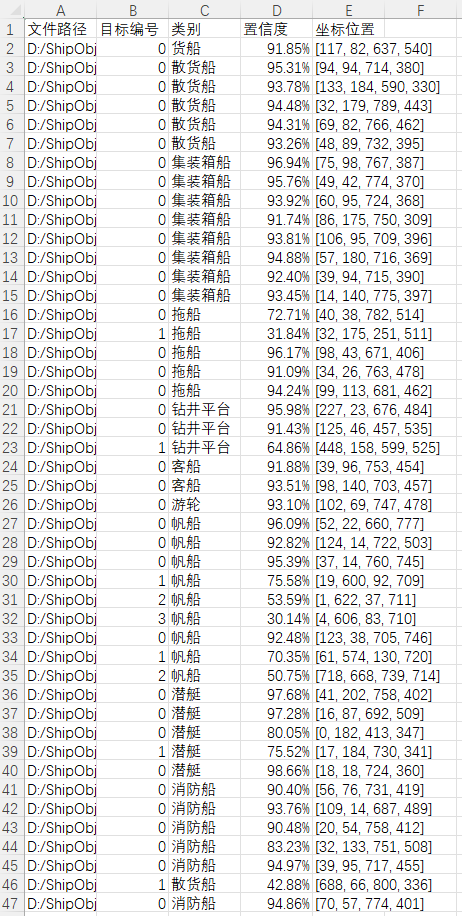 该CSV文件记录了图片的相关信息,并包含以下几项具体数据:每张图片的路径信息、每张图片中目标物体的具体数量及其对应的编号、每种物体所属的目标类别以及检测结果的置信水平,并详细标注出每个目标物体在图像中的具体位置坐标值(具体指的是每个检测框在图像中占据的位置范围的坐标值)。