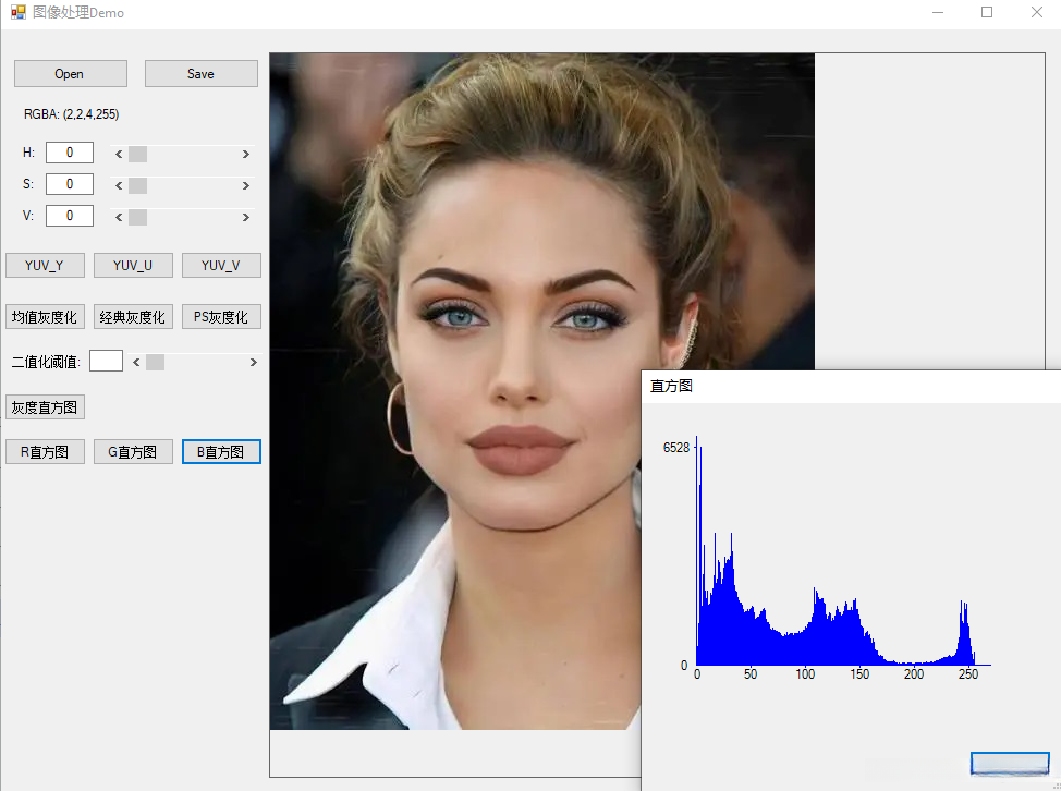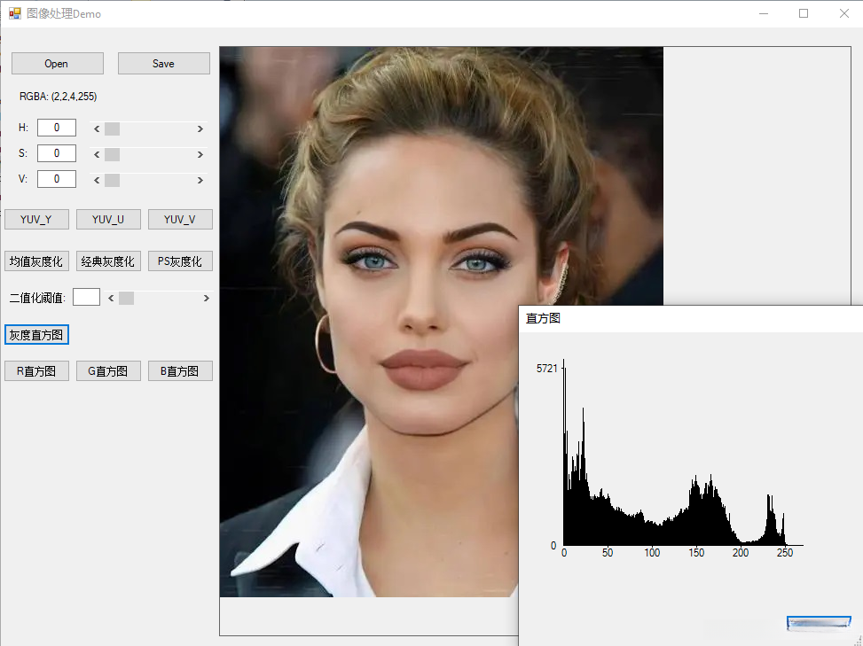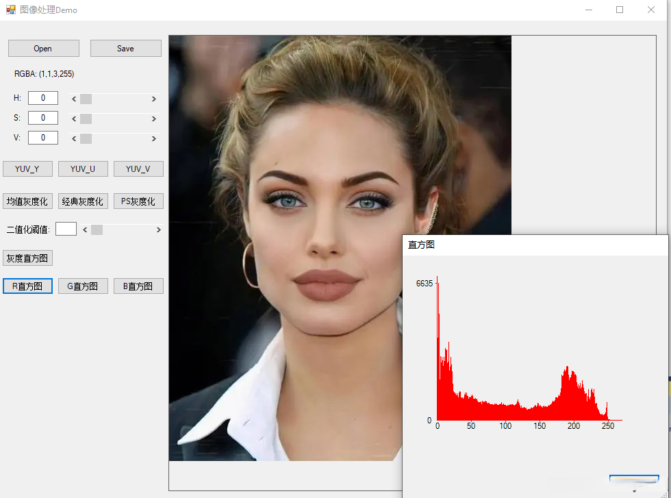演示程序主界面如下图所示,具有图像读取、显示、保存、显示RGBA值、HSV调整、提取YUV分量、灰度化、二值化、直方图等功能。