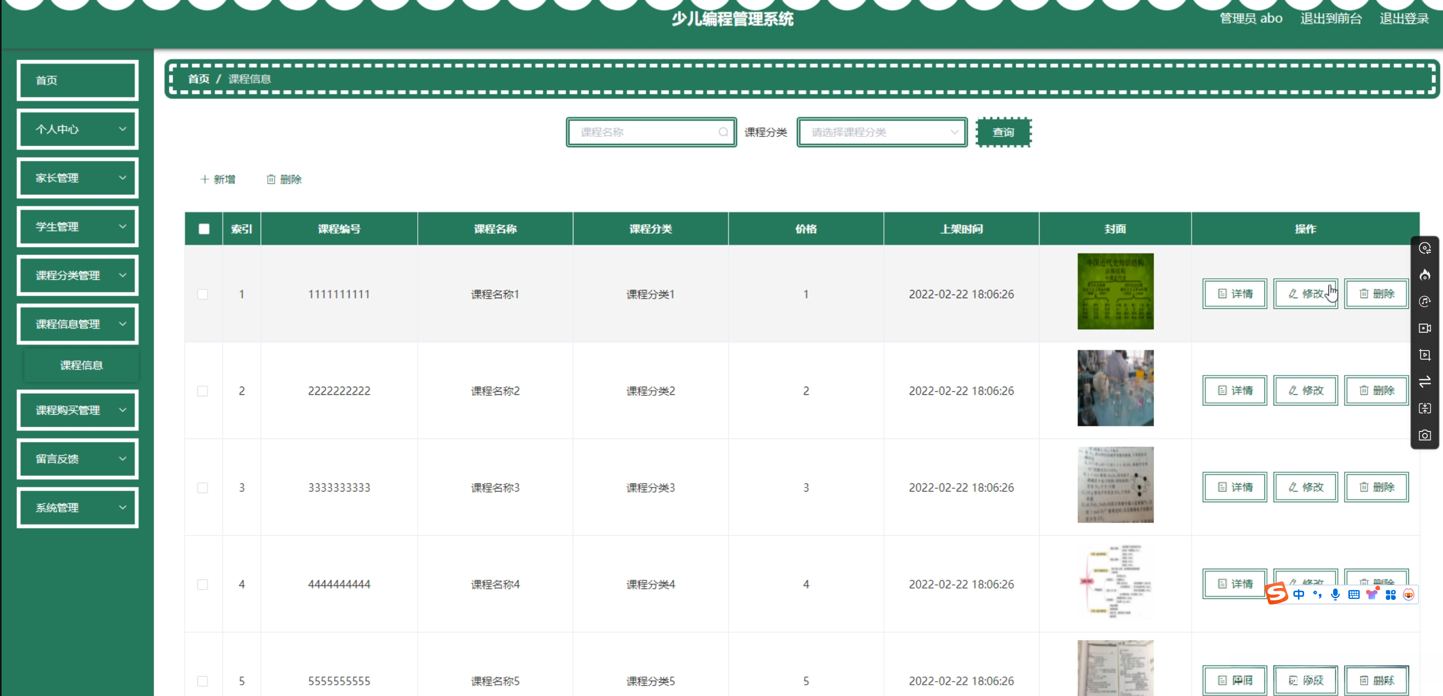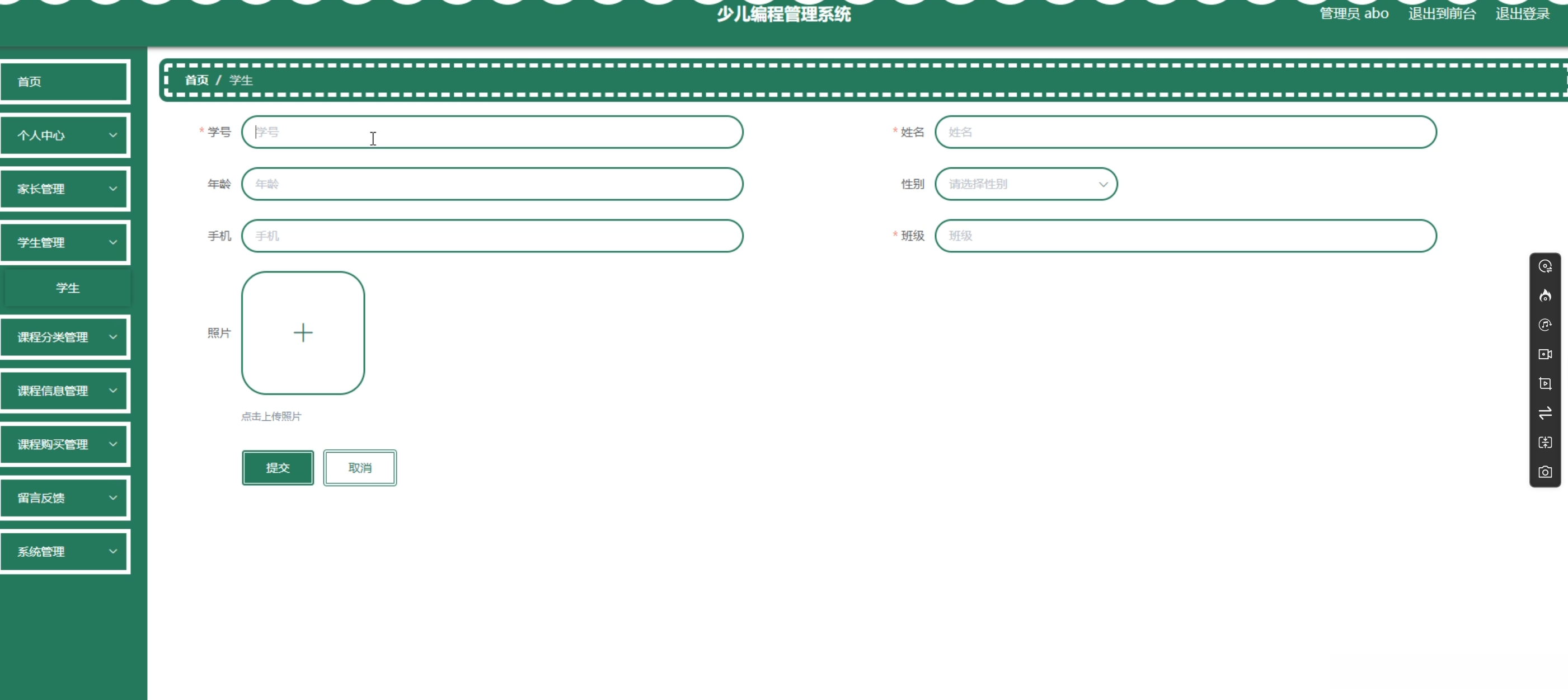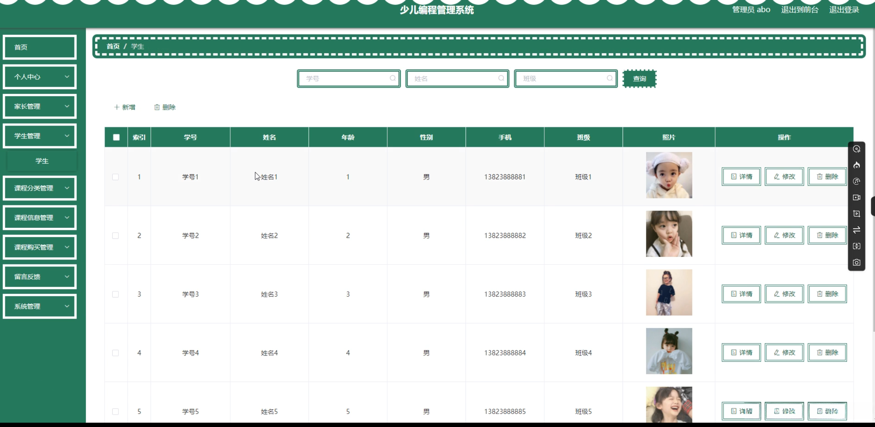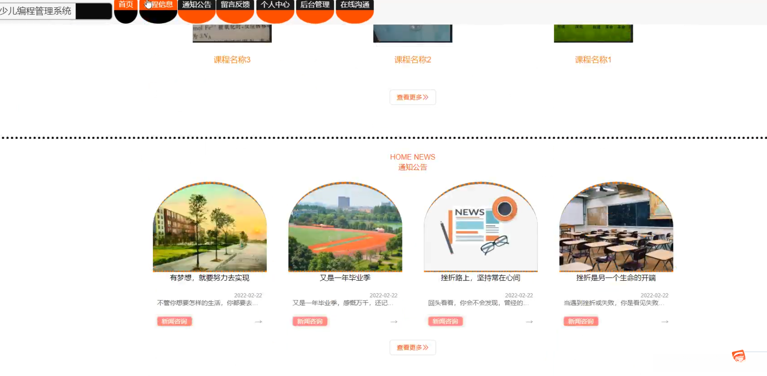 基于SpringBoot框架构建的一套功能完善、稳定且安全的少儿编程管理系统,在学生信息管理方面实现了学生成绩追踪与报告生成,在教师信息管理方面提供了课程大纲设计与批处理作业功能,在课程信息管理方面支持智能排课与进度监控,在选课信息管理方面具备智能推荐与错课登记提醒等功能部分。通过优化配置实现教学过程中的无缝衔接,在课程安排上采用灵活多样的时间段划分策略,在选课流程上设置了智能提示与错时排课机制;通过引入智能化评估指标体系实现对学生学习效果的有效追踪,在个性化学习指导方面提供动态化辅导方案;通过整合大数据分析技术实现精准的教学目标预测;通过引入智能化排课算法实现资源的最佳利用;通过建立多层次反馈机制收集学生的意见与建议;在服务质量方面注重用户体验的持续优化;在系统稳定性方面实现了高并发下的无故障运行能力;在数据安全性方面采用了先进的加密技术和访问控制措施;在易用性方面提供了友好的人机交互界面;在可扩展性方面支持多平台协同工作环境的构建