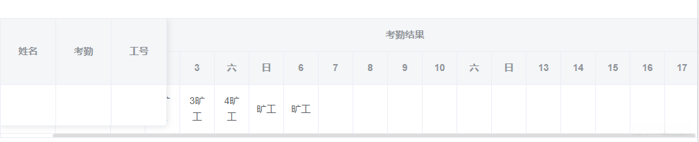 效果图讲解:前三列是固定列,后面的数字是日期,今天是几号就截止到几号,我这里是17号,数据可以根据接口显示,我这没有绑定接口数据