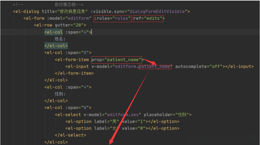 在element元素的表单组件中添加:rules属性,其值设定为从data中定义好的rules字段用于执行规则验证,同时还需要设置ref属性用于获取DOM节点.该:rules属性会在用户提交表单内容时作为实参传递给处理方法以执行表格填写后的数据校验.完成这些设置后,为了确保后续操作顺利进行,请在需要验证的具体input元素上设置prop属性.需要注意的是,prop值不仅要与v-model绑定的表单字段名称保持一致,并且也必须与data中的:rules字段名完全一致,这样才能明确指定了采用了哪一种类型的校验规则.