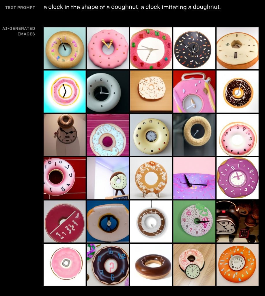 多模态人工智能的最新例子是OpenAI的DALL-E,该模型使用艺术家萨尔瓦多-达利和皮克斯的瓦力的谐音来命名。它可以从文本描述中生成对应图像。例如,当文本描述为"一个甜甜圈形状的时钟 "被发送到该模型时,它就可以生成以下图像。