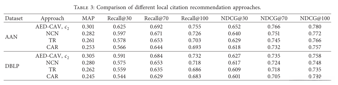 本文提出了一种基于注意力的本地引文推荐算法(AED)模型;首先构造了一个编码器,在低维空间中将引文上下文表示为向量,然后构造了一个融合期刊会议信息和作者信息的注意机制,并使用RNN构造解码器;最后,它将解码器的输出映射到softmax层,并通过给定的引文上下文、作者信息和地点信息对科学论文进行评分。推荐参考论文列表是根据得分较高的科学论文生成的。我们在DBLP和ACL Anthology Network (AAN)数据集上进行了实验,结果表明,基于AED的方法性能优于其他三种基线方法。