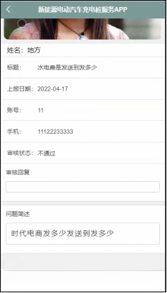 故障上报,在故障上报页面可以查看姓名,标题,上报日期,账号,手机,审核状态,审核回复,问题简述等信息;如图5-6所示。