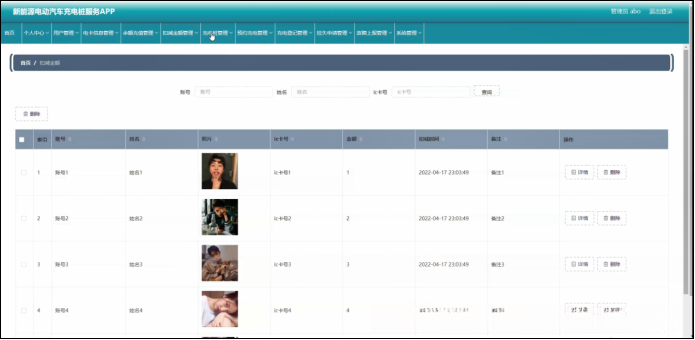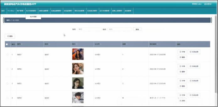 电卡信息管理,在电卡信息管理页面可以对索引,账号,姓名,照片,IC卡号,金额,登记时间等内容进行详情、扣减金额或删除等操作;如图5-11所示。