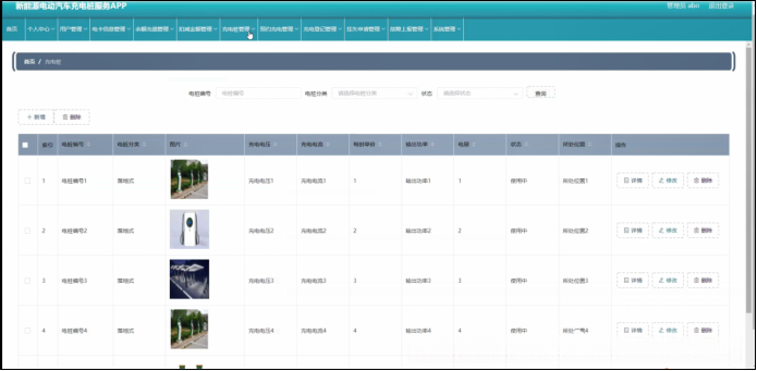 充电桩管理,在充电桩管理页面可以对索引,电桩编号,电桩分类,图片,充电电压,充电电流,每时单价,输出功率,电量,状态,所处位置等内容进行详情,修改或删除等操作;如图5-14所示。