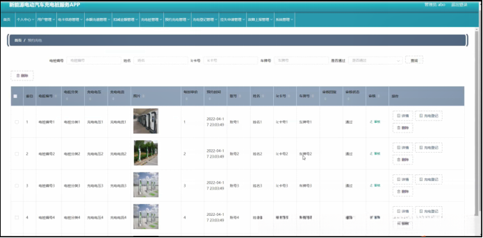 预约充电管理,在预约充电管理页面可以对索引,电桩编号,电桩分类,充电电压,充电电流, 图片,每时单价,预约时间,账号,姓名,IC卡号车牌号,审核回复,审核状态,审核等内容进行详情,充电登记或删除等操作;如图5-15所示。
