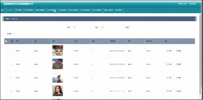 余额充值管理,在余额充值管理页面可以对索引, 学号,姓名,照片,IC卡号,金额,充值时间,备注,是否支付等内容进行详情和删除等操作;如图5-12所示。