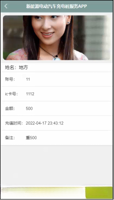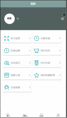 用户,在我的页面可以对电卡信息,余额充值,扣减金额,预约充电,充电登记,挂失申请,故障上报,我的收藏管理,在线客服等详细信息进行操作;如图5-7所示。