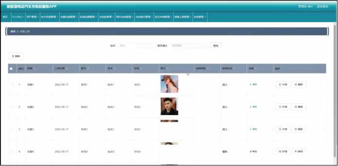 故障上报管理,在故障上报管理页面可以对索引,标题,上报日期,账号,姓名,手机,照片,审核回复,审核状态,审核等内容进行详情或删除等操作;如图5-16所示。