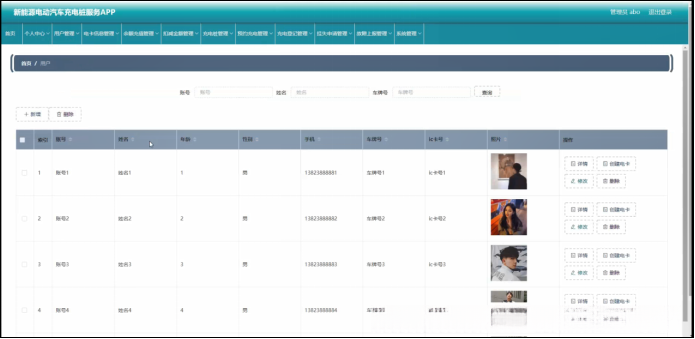 用户管理,在用户管理页面可以对索引,账号,姓名,年龄,性别,手机,车牌号,IC卡号,照片等内容进行详情、创建电卡、修改或删除等操作;如图5-10所示。