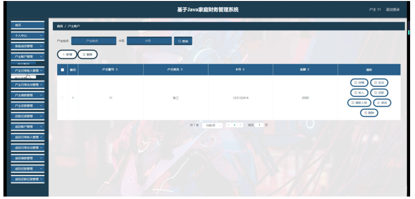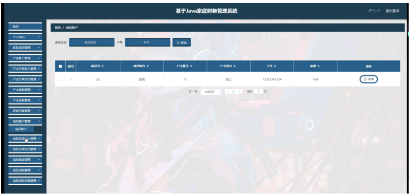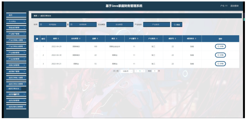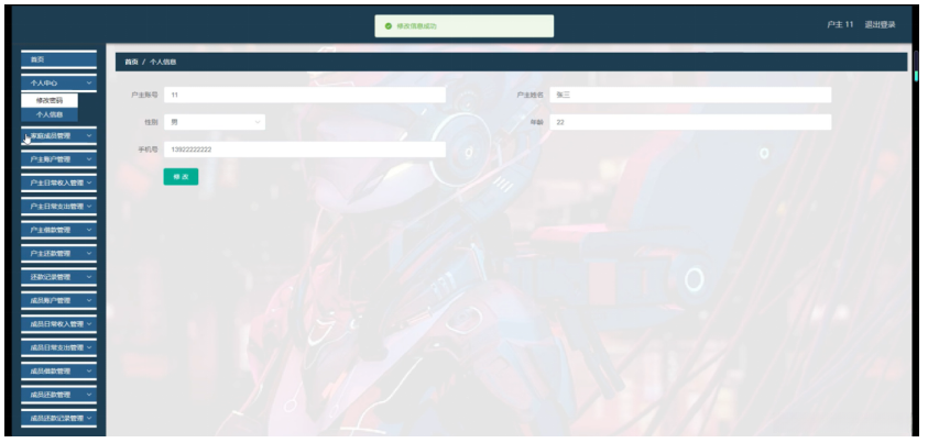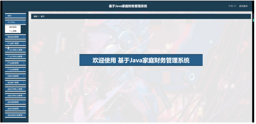 用户可以在家庭财务管理系统中浏览首页以及多个功能模块以完成具体操作:包括[户主类]的个人中心查询和[家庭类]的各项财务管理事务等