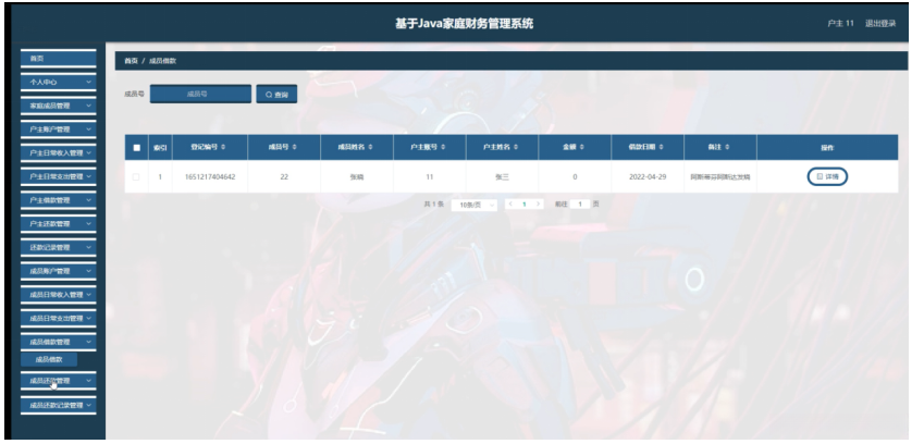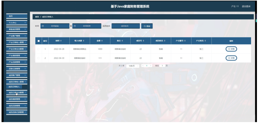 个人收入信息管理模块;在个人收入信息管理界面中支持对各项数据项的详细查看功能;包括编号字段、姓名字段以及家庭成员姓名字段等基础信息项,并提供详细的金额记录和来源渠道记录。