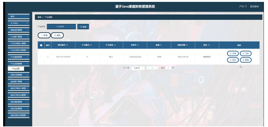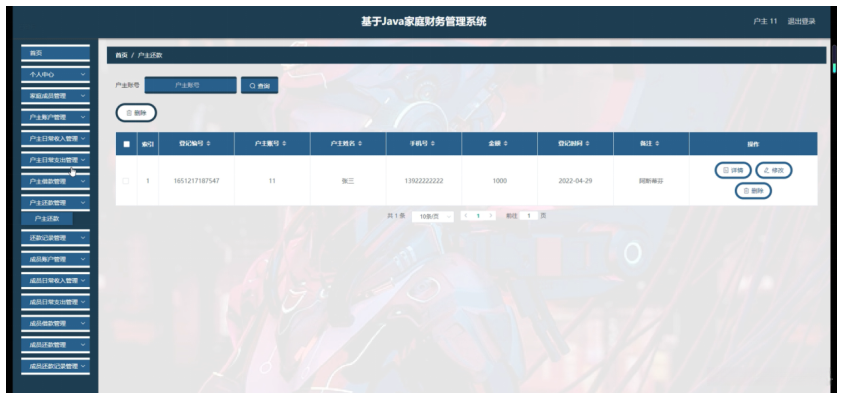 客户还款管理功能模块;在客户还款管理页面中提供了丰富的操作选项:包括对索引号(即账户编号)、登记编号(记录标识)、客户账号信息(账户名)、客户姓名资料(姓名字段)、联系电话(联系电话区)、交易金额数值以及记录时间点等核心数据项的支持下开新记录(详情)、修改现有记录(修改)以及删除多余记录(删除)的操作功能;具体操作界面如图5-8所示。