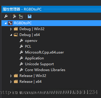 创建一个新的项目,并对其实现方案进行设置;在属性管理器的Debug\ x64设置中添加前面两个属性表