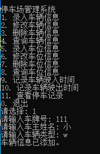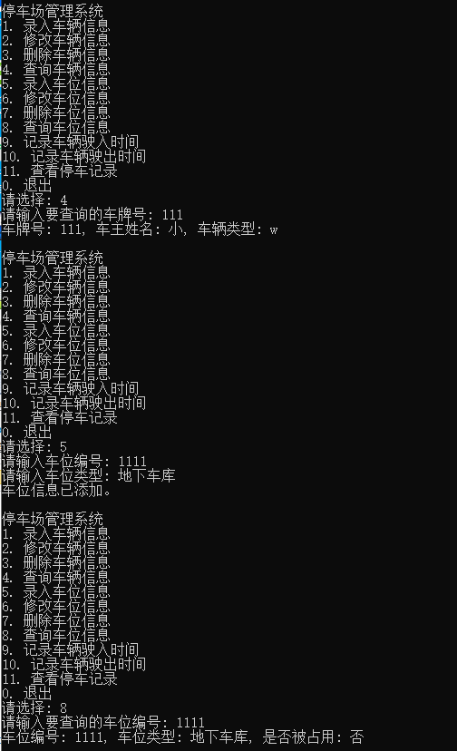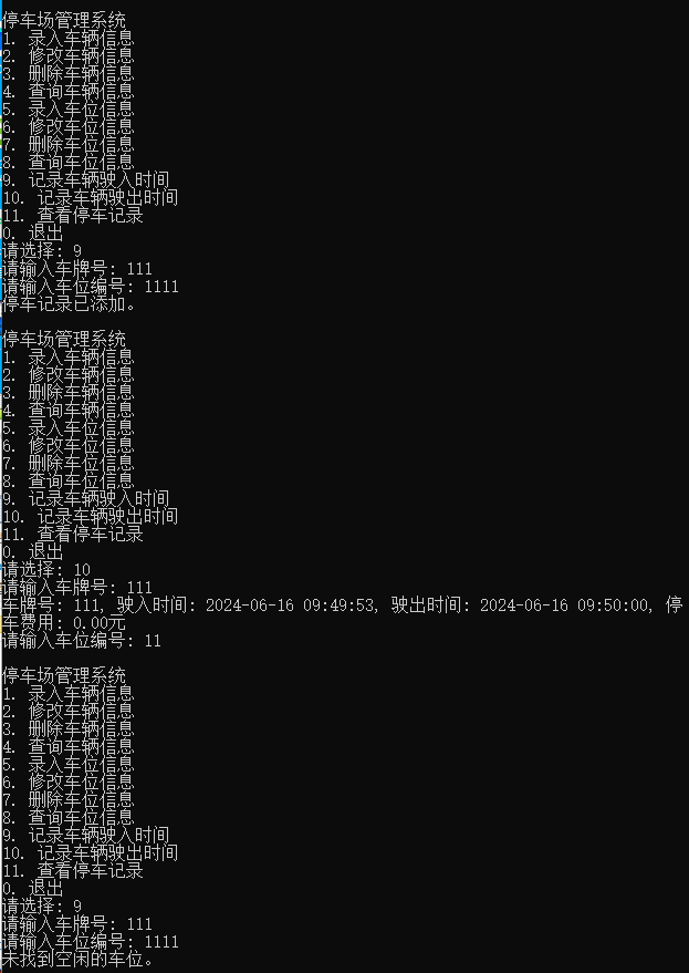 部署要求中的代码部分包含无效图片链接。该代码定义了三个结构体:Vehicle 用于存储车牌号(char plateNumber[20])、车主姓名(char ownerName[50])、车辆类型(char vehicleType[20])及指向下一个车辆节点的指针(struct Vehicle next);ParkingSpot 存储车位编号(int spotID)、车位类型(char spotType[20])、是否被占用(int isOccupied)及指向下一个车位节点的指针(struct ParkingSpot next);以及 ParkingRecord, 存储车牌号(\ char plateNumber[20])、驶入时间(\ char entryTime[20])、驶出时间(\ char exitTime[20]) 和停车费用(\ float fee),并指向下一个停车记录节点的指针 (\ struct ParkingRecord *next$`). 这些结构体为停车系统提供了数据模型的基础。