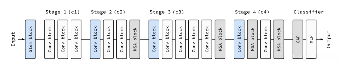 如图是基于ResNet50的AlterNet的网络结构,白色块代表Conv块,灰色块代表MSA块,蓝色块代表下采样块,相较于ResNet,作者将每一个stage尾端的Conv模块替换成了MSA块。