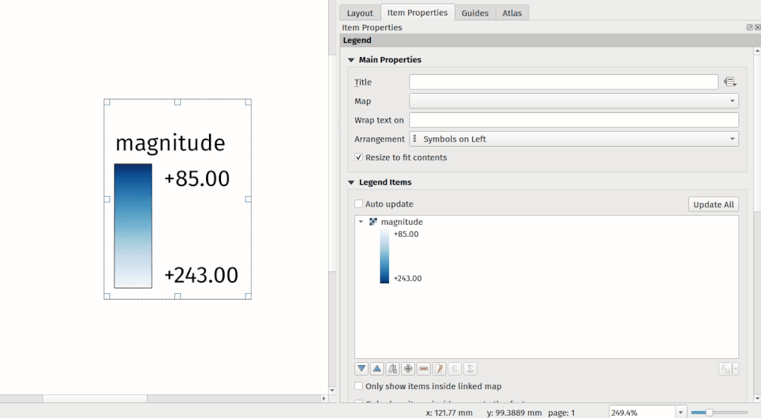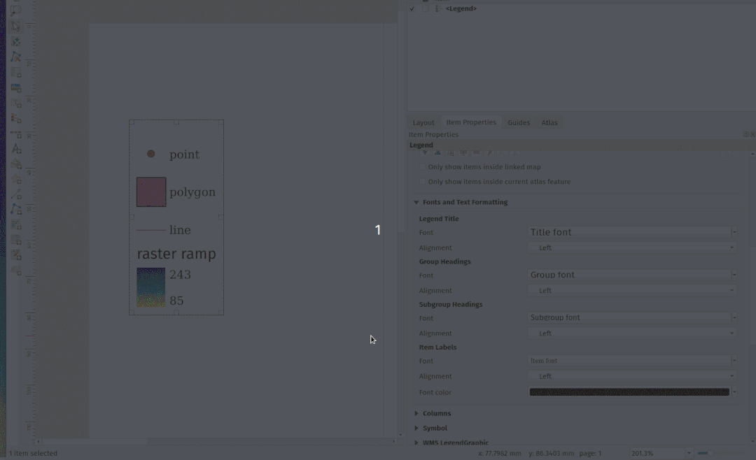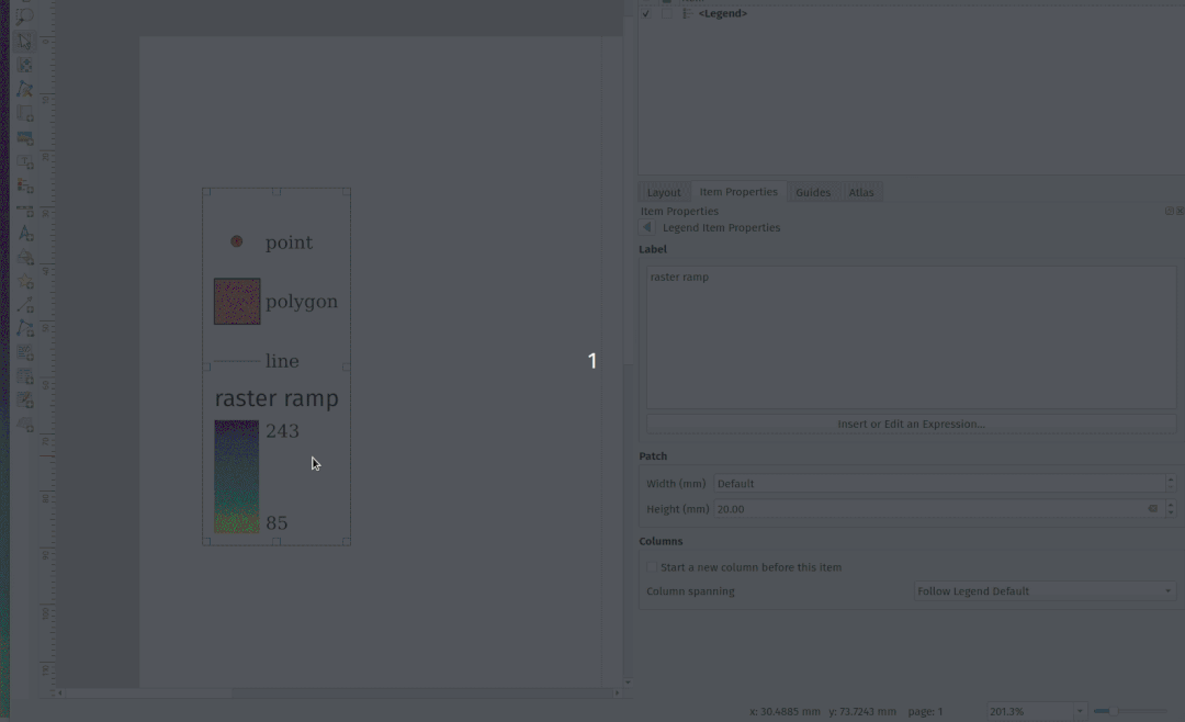 在打印布局中进行渐变色图例的设置时,默认情况下会采用一种较为简便的方式进行配置操作。传统的绘制流程相对复杂费时,在3.18版本开始,在图例功能中新增了对渐变色的支持。目前系统支持线性插值伪彩色渲染栅格层、单波段灰度渲染栅格层以及基于渐变色的点云展示。然而,在矢量数据图形处理方面仍处于初步阶段,并未实现基于矢量数据的图形展示功能