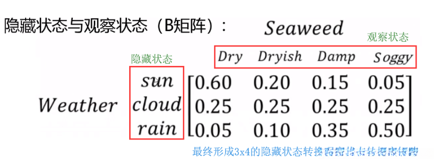 从上面的天气与海藻的状态举例,生成观察状态的概率矩阵B如下: