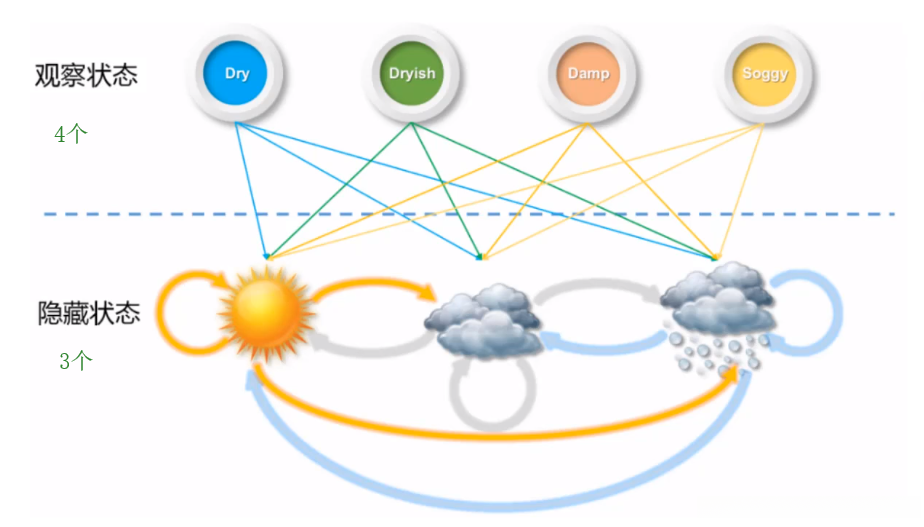 与之前不同之处在于,隐马尔科夫模型引入了某种辅助变量。这种辅助变量是我们能够方便地观测或收集到的。