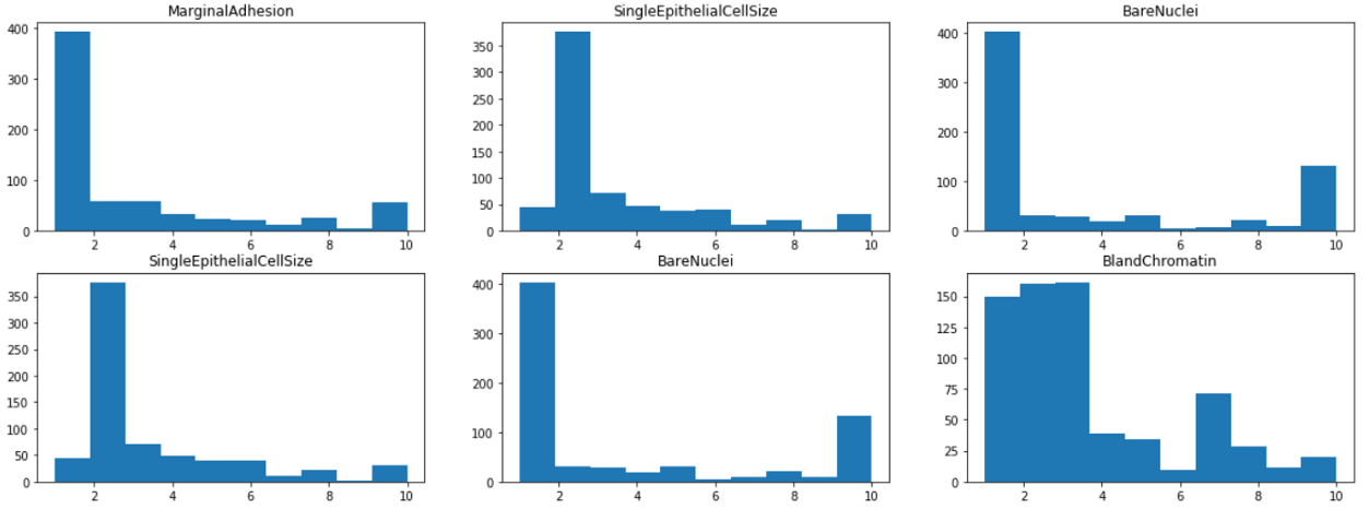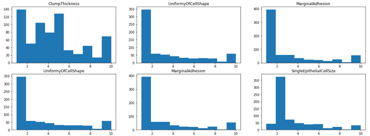 通过可视化每个特征的直方图,我们发现大多数特征都有1或2的模式,除了块状和淡色质,其分布在1到10之间更为均匀。这表明团厚和乏味的染色质可能是该类的较弱的预测因子。