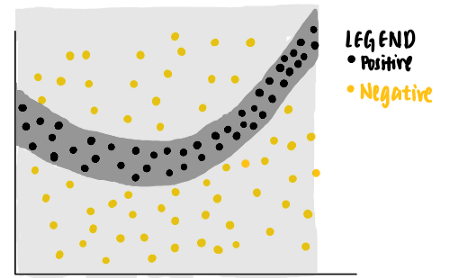 听起来很难理解。让我们一步一步地把它分解。假设我们有以下具有两个特征的玩具数据集。每个数据点都与一个基本真相标签(正或负)相关联。