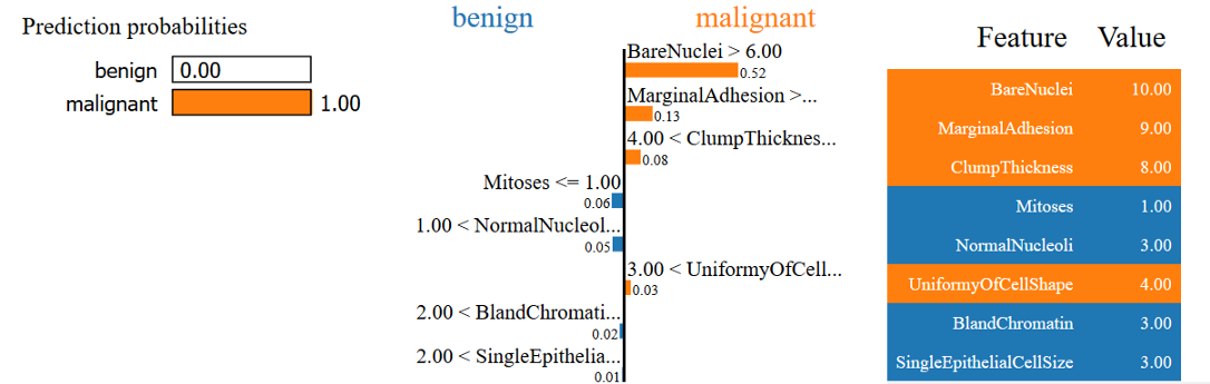 总的来说,考虑到样本的所有特征(在右边的面板上),样本被预测为恶性。