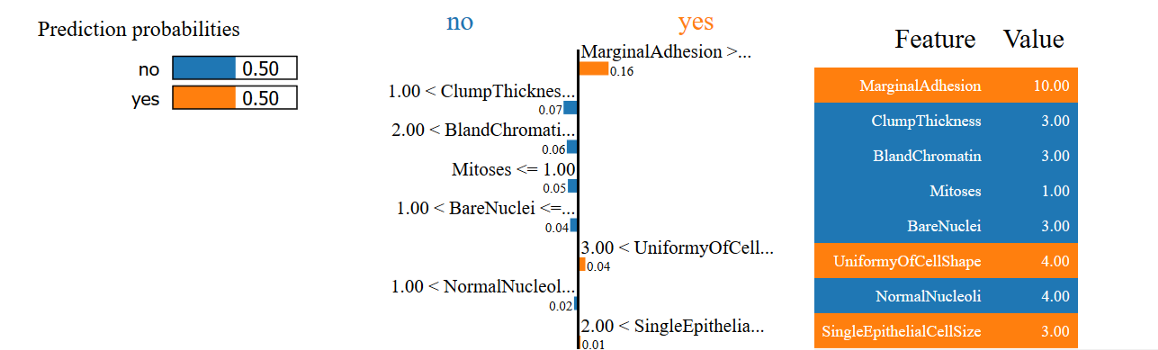 在最后一个例子中,我们看到这个模型无法很好地预测细胞是良性还是恶性。你能用LIME的解释明白为什么会这样吗?