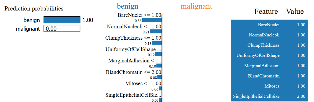 在这里,我们有一个细胞样本,预测是良性的,实际上是良性的。LIME通过引用(除其他原因外)解释了为什么会出现这种情况