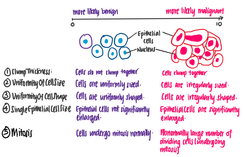 威斯康星州乳腺癌数据集[3],由UCI于1992年发布,包含699个数据点。每个数据点代表一个细胞样本,可以是恶性的也可以是良性的。每个样品也有一个数字1到10,用于以下特征。