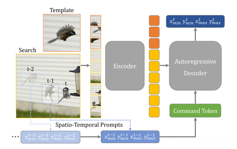 先利用编码器将模板与搜索图像的视觉特征进行编码,接着,解码器基于空间时空中文推断结果、命令输入及视觉信息来解析当前时间t处的空间时空中文token序列.其中,空间时空中文推断结果为解码器输出的关键中间结果.