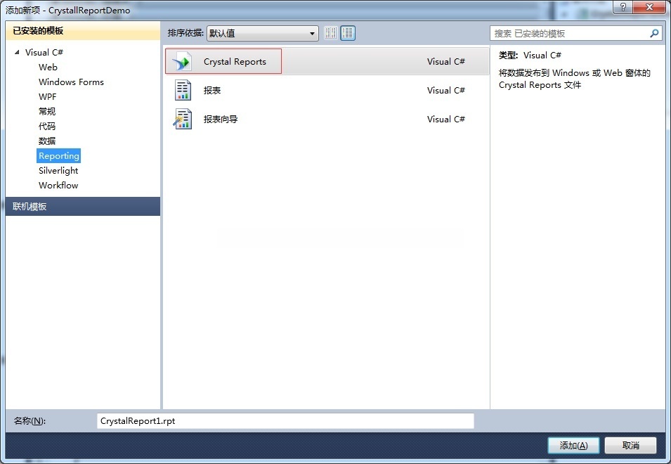 首先新建一个asp.net项目,然后新建Crystal Reports文件。